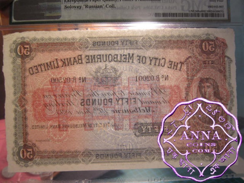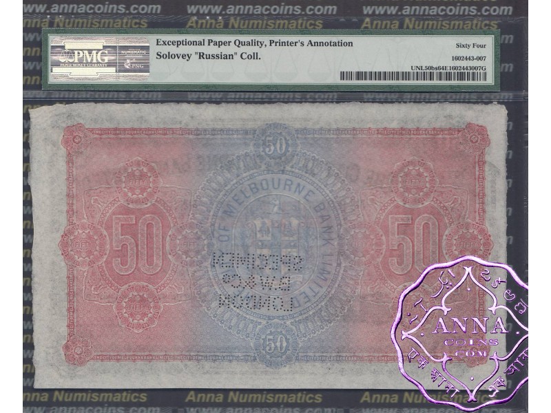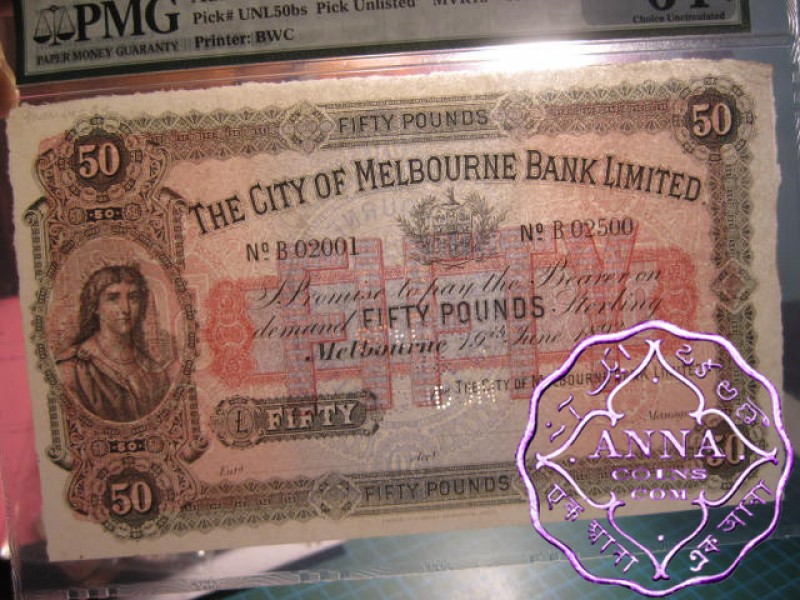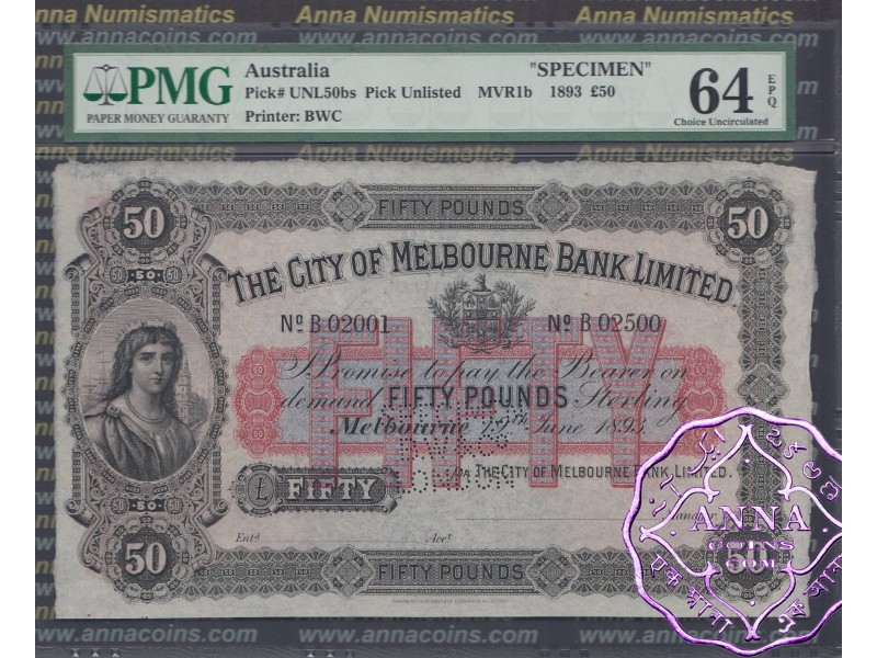 Australia City of Melbourne Bank Limited £50 19.6.1893 Pick-UNL Specimen.