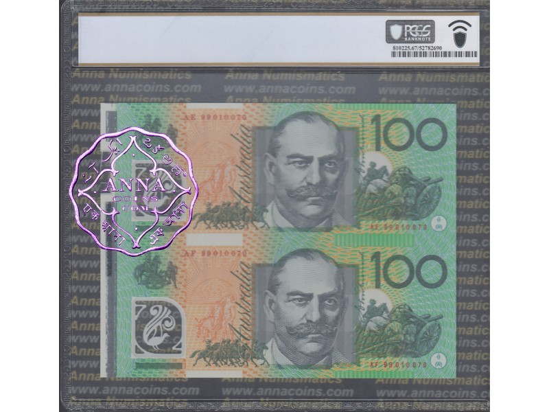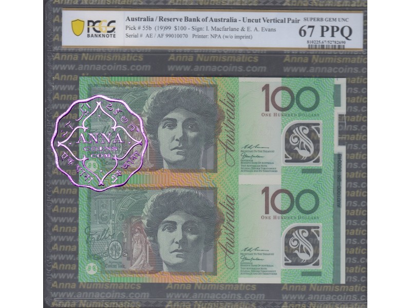 1999 $100 U13 Macfarlane/Evans Uncut of 2 Red PCGS 67 PPQ