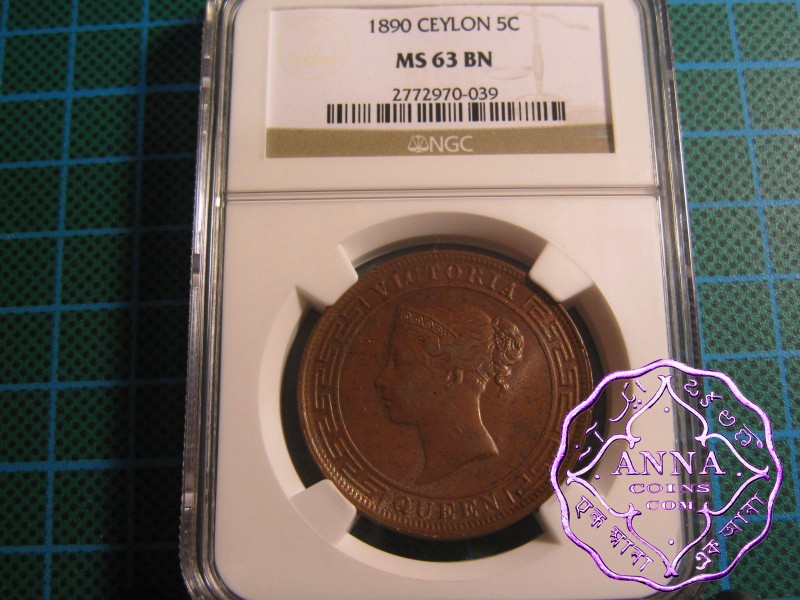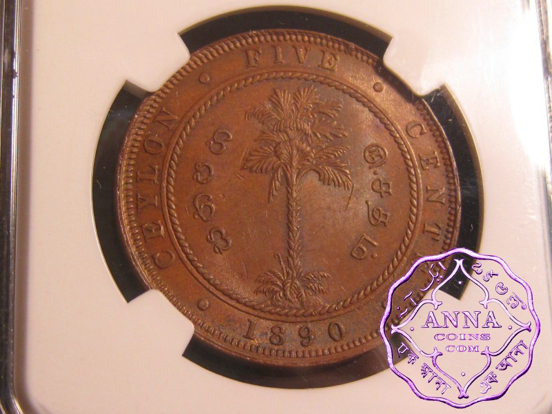 Ceylon 1890 Victoria 5 Cents NGC MS63BN