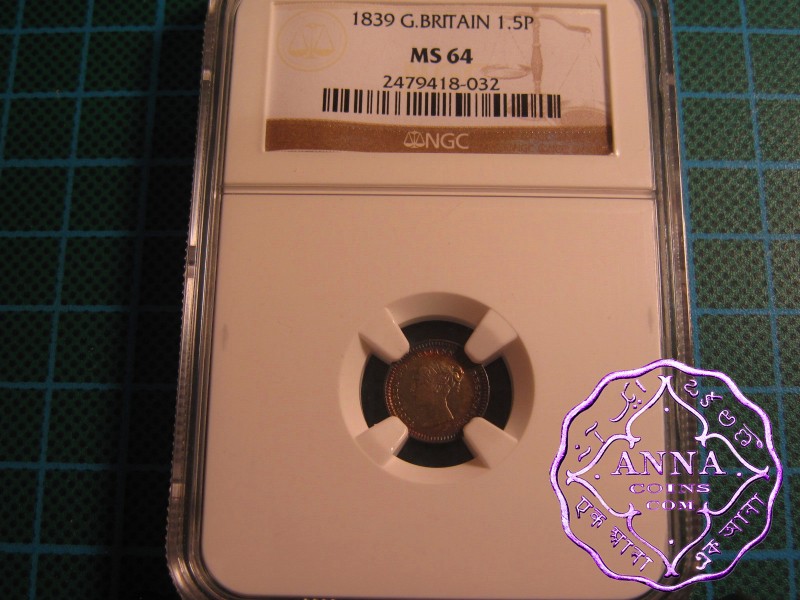 Great Britain 1839 Victoria 1 1/2 Pence NGC MS64