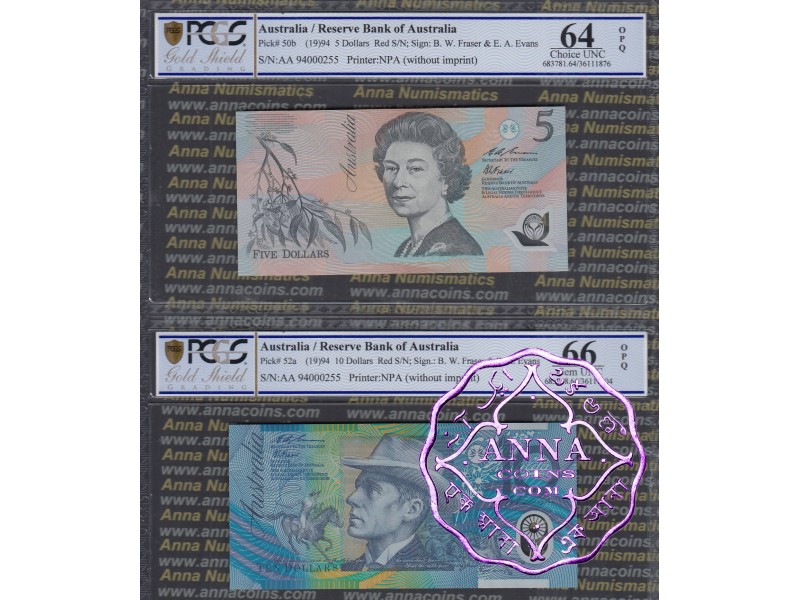 1994 $5 & $10 Red AA94000255 Matching Pair PCGS