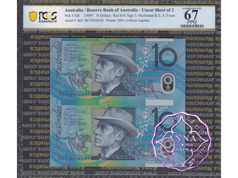 1997 $10 U21 Macfarlane/Evans Uncut of 2 Red PCGS 67 OPQ