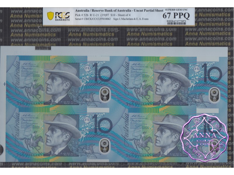1997 $10 U21 Macfarlane/Evans Uncut of 4 Red PCGS 67 PPQ